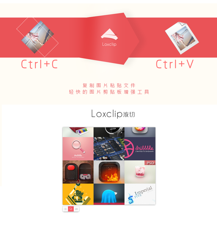 复制图片粘贴为文件Windows复制到剪贴板的图片(例如网页中,画板中,PrtscSysrq按键截屏)只能作为图片数据在各种作图工具中使用,而不能作为图片文件粘贴保存,非常的可惜,通过Loxclip液切你可以直接把剪贴板里的图片作为文件粘贴出来。从此你可以更快捷的保存网页里的图片,正在制作的图片...你拥有了更加自由的操作可能!把剪贴板直接通过Ctrl + C和Ctrl + V从图片编辑器中保存图片收集模式Loxclip液切不仅仅让图片可以作为文件粘贴,还有收集模式可以让你在网络收集图片时更加方便,流畅你在收集模式中可以多次复制一次粘贴:你复制的图片将暂存在收集器中,当你需要时可以一次性粘贴出去。小工具!截图(可自定义外部工具)+取色(直接复制鼠标位 色彩为HTML色彩代码到剪贴板)+自定义快捷键普通模式把剪贴板的里图片如实粘贴为文件,同时只能粘贴一个文件收集模式中间的红色亮起(右键点击收集按钮快速切换收集)可以多次复制图片,复制图片暂存在收藏器中,等到需要时您可以一次性粘贴所有图片点击中间的收藏按钮可以查看和管理收藏器中的图片暂停模式数字显示为2个横杠(右键选项按钮快速切换暂停模式)暂停停止Loxclip的功能,如果你在PS图片需要复制粘贴编辑图片就可以暂停Loxclip,因为开启Loxclip图片只能作为文件粘贴而不能作为数据粘贴到画板里了·语言设置:中文,English,日本语三中语言可供选择。机器翻译,聊胜于无...选项·跟随鼠标:小悬浮窗可以跟随鼠标移动·隐藏悬浮窗:隐藏小窗口,你可以在系统右下角的托盘找到Loxclip·快捷键:控制截图,取色,动,收集模式的快捷键,默认为空,需要时设为自己喜欢的按键·截图:可使用外部截图工具,自带一个QQ截图,(可以点击 “...” 按钮选择你自己喜欢的截图工具(推荐小巧的5个截图工具))·取色:复制鼠标位置色彩为HTML色彩代码到剪贴板+收藏窗口右键图片打开临时图片目录恢复中断的复制你有没有过复制了一张图片,然后又复制了一段文字,然后你想要用那张图片时发发它被文字覆盖了...当使用用Loxclip时,你可以避免复制作业被打断,你可以在收集器窗口点击“REF”键,重新把Loxclip中的图片重新载入剪贴板非常不幸的这个软件的源代码因为电脑硬盘损坏而丢失了,一般我都会备份的,然而这个并没有教育以后开发的东西还是都放到GitHub或者Coding上去。)...所以这个软件一直没有更新...不过没关系,我有时间会重新开发的,这个工具我自己是经常使用的,配合PicPick截图工具(设置成截图输出到剪贴板)截图保存异常方便。这一切都是免费的,如果 你喜欢这个产品,就在心中默默支持吧